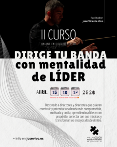 Un proyecto que trabaja «La mentalidad de dirigir liderando», con formaciones, mentorías, charlas, métodos y «Lidera tu agrupación musical con maestría», un cuaderno de trabajo para directores y directoras musicales que quieren subir al siguiente nivel y crear una cultura de trabajo en equipo de éxito. Más info: https://josevivo.es/lidera